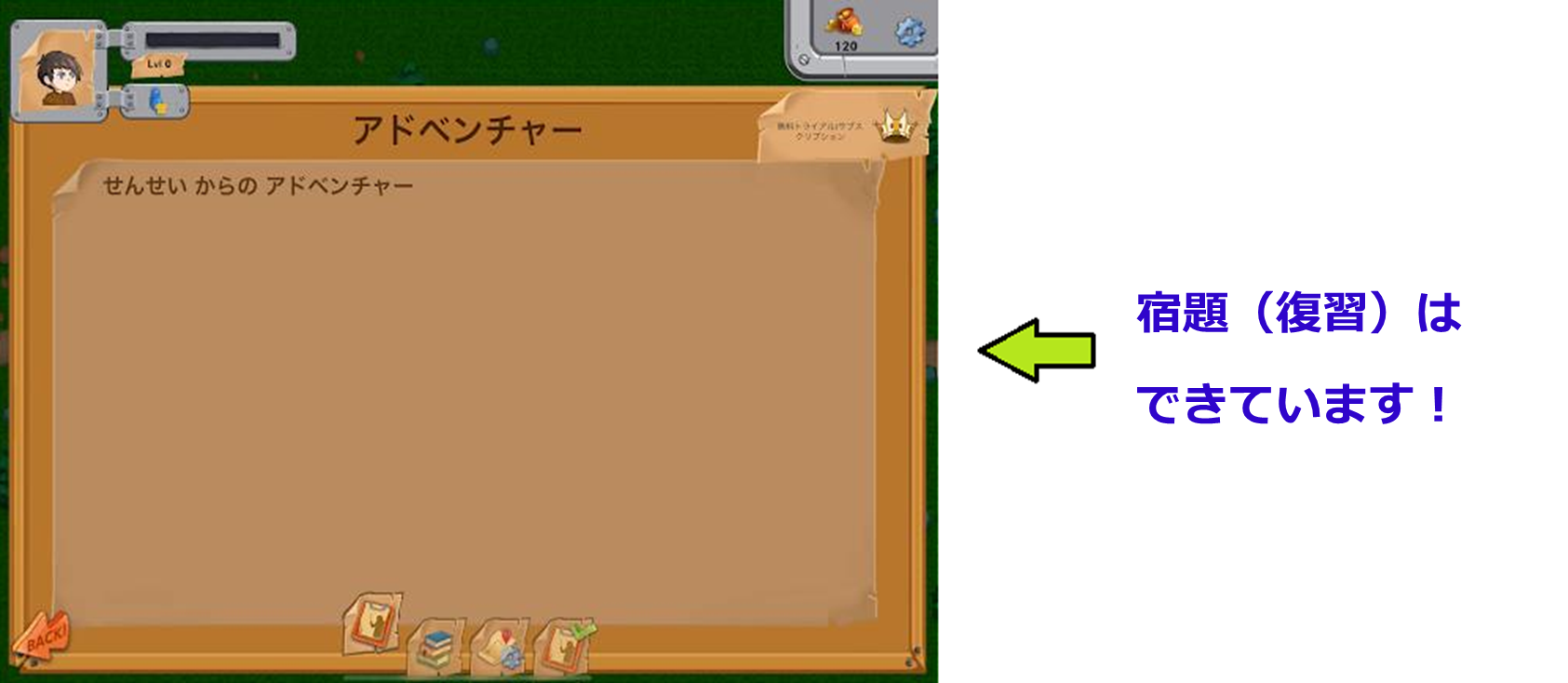 「アドベンチャー」が空になっている⇒アドベンチャー(宿題/復習)が”終わっている”状態